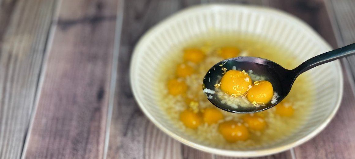 3. 另備一小鍋煲滾水500毫升,加糯米酒和冰糖,煮滾後加糖桂花醬,再加入南瓜小丸子稍煮,下少許乾桂花裝飾。